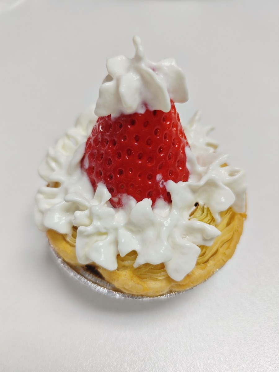 最后是草莓松饼塔。松饼粉里加一个鸡蛋,再加点水,直接在袋子里摇匀,剪个小口就能下锅。煎好的松饼软软的,带着淡淡的蛋香。按照大小叠成四层,每一层都现挤奶油,铺上草莓和蓝莓,最顶上放一颗大草莓,草莓松饼塔正式完成。