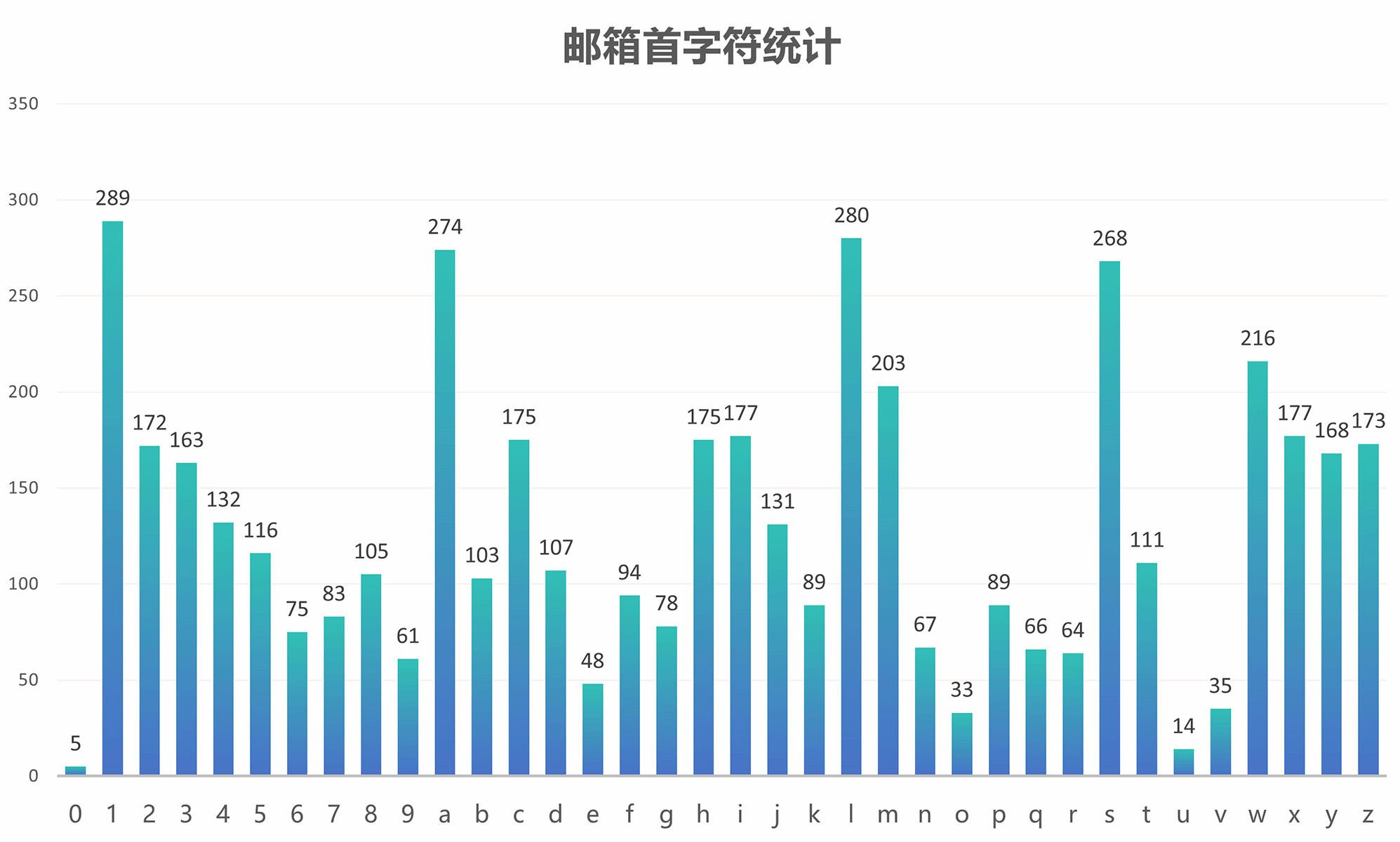 当我翻阅这份由 4616 个邮箱组成的名单,就像在解读星光的密码。开头的字符悄然勾勒出一个有趣的轮廓:“1”、“l”、“a”名列前茅。而邮箱后缀的分布,则揭示了这片星系的构成:qq.com、163.com、gmail.com,这三个名字,如同星河中的主要星云,承载了大多数故事的起点。