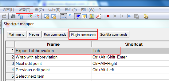 Emmet官网建议将TAB设置成快捷键输出,如果你愿意可以自由设置,Notepad++软件的快捷键设置在设置栏目->管理快捷键->Plugin commands处设置。