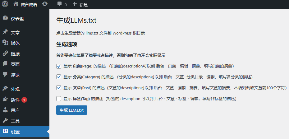 考虑到功能并不复杂,我决定自己动手编写一个 WordPress 插件来生成 llms.txt,并严格遵循社区规范。