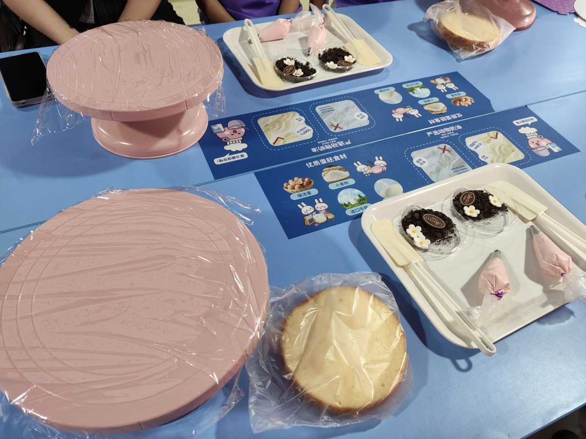 到了三楼教室,材料早就准备好啦,香喷喷的蛋糕胚,粉粉的奶油,小朋友们瞬间变身“小小蛋糕师”。