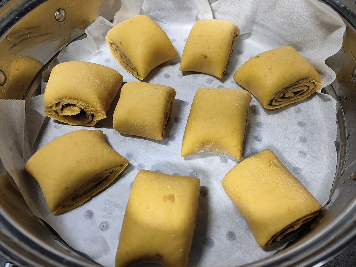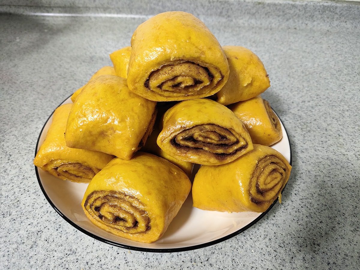 剩下的面团也没浪费,我们买了豆沙做了南瓜豆沙花卷。做法更简单些:把面团擀薄,均匀抹上豆沙卷起来,切成小段就好。不过这次买的豆沙稍微有点干,虽然味道不错,但还是南瓜馅的更得人心。